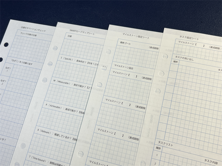 | 3.『マイルストーン設定シート』 | 最終ゴールから逆算(バックキャスティング)し、達成までの中間目標(マイルストーン)を明確に設定します。これにより、長期的な計画の進捗管理が可能になり、モチベーションが維持しやすくなります。 |