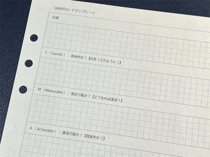 | 2.『SMARTロードマップシート』 | SMARTの法則の5つの基準(具体的、測定可能、達成可能、関連性、期限)に沿って、あなたの目標を具体的で実行可能な「目標宣言」へと磨き上げます。あなたの行動の最高の指針となります。 |