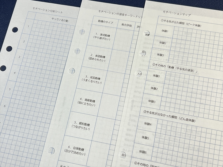 | 3.『モチベーションマップ』 | 過去の「やる気が出た/出なかった」経験を具体的に分析し、あなただけの「やる気の地図」を完成させます。あなたのモチベーションタイプを特定する、自己分析の集大成です。 |